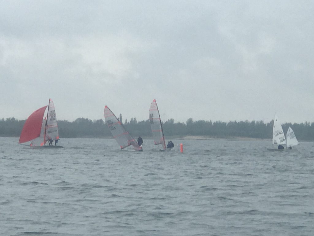 Um die große Anzahl (ca. 66 Boote) von verschiedenen Jollen-Typen im Griff zu behalten, wurde auf Innen- und Außenbahnen gesegelt. Insgesamt konnten so 2-3 Wettfahrten gefahren werden. Klatschnass und erschöpft kamen die Segler am späten Nachmittag zurück in den Hafen.